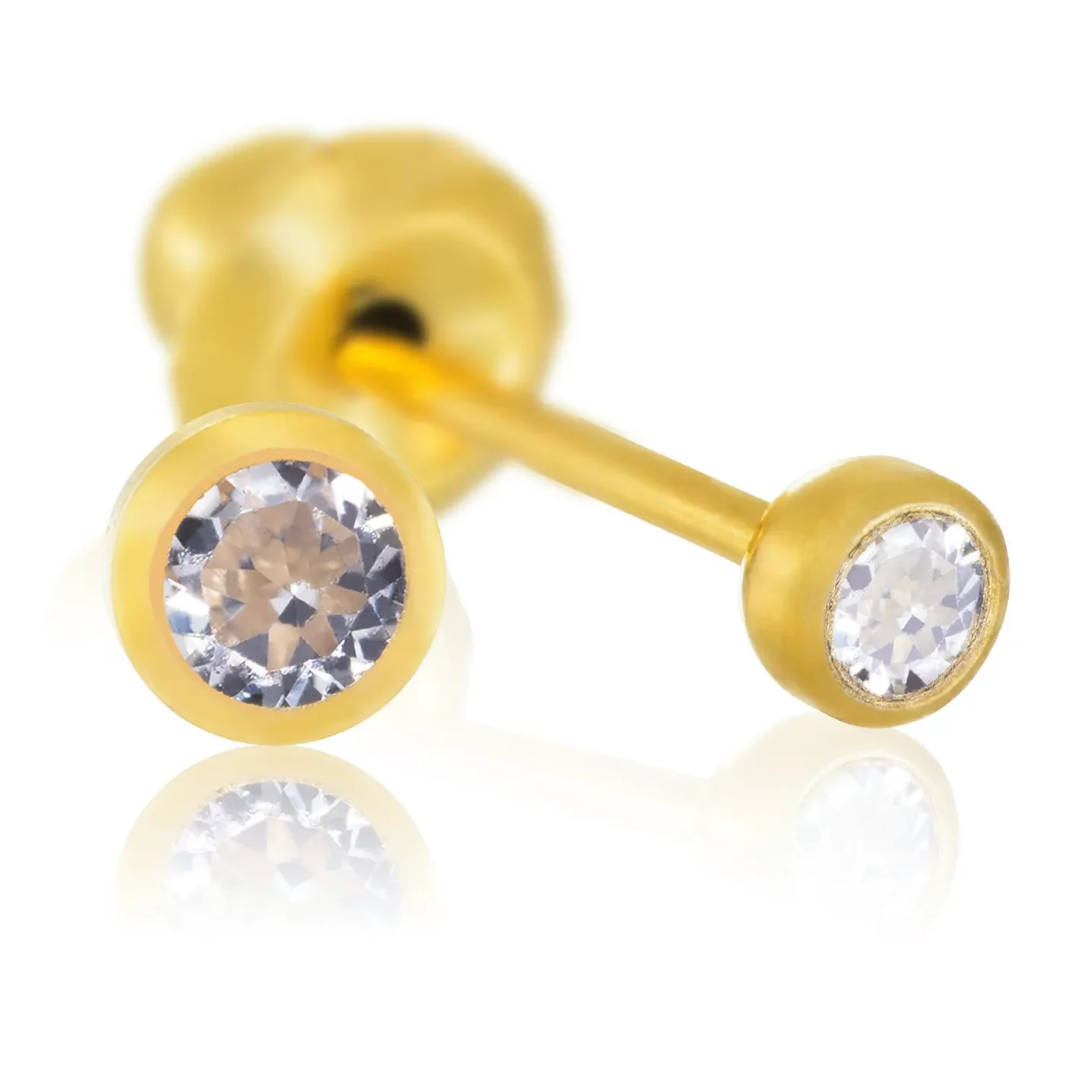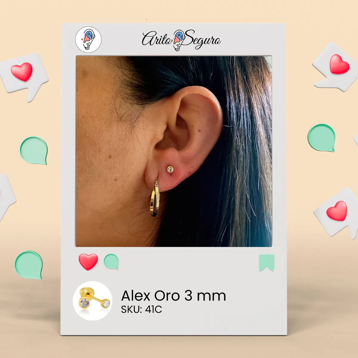 ✅ Alex Oro con Circón (3 mm): El baño de Oro 24 kt junto al circón brillante es la opción más hipoalergénica y hermosa, minimizando la irritación.